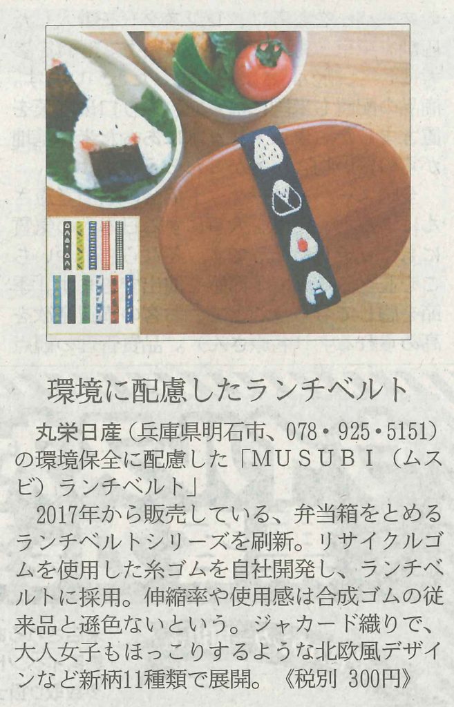 この度、環境保全の取り組みとしてリサイクルゴムを使用した糸ゴムの自社開発に日本で初めて成功し、自社ブランド「MUSUBI(ムスビ)ランチベルト」新柄11種類の原材料として使用し、2021年1月21日に新発売いたしました。